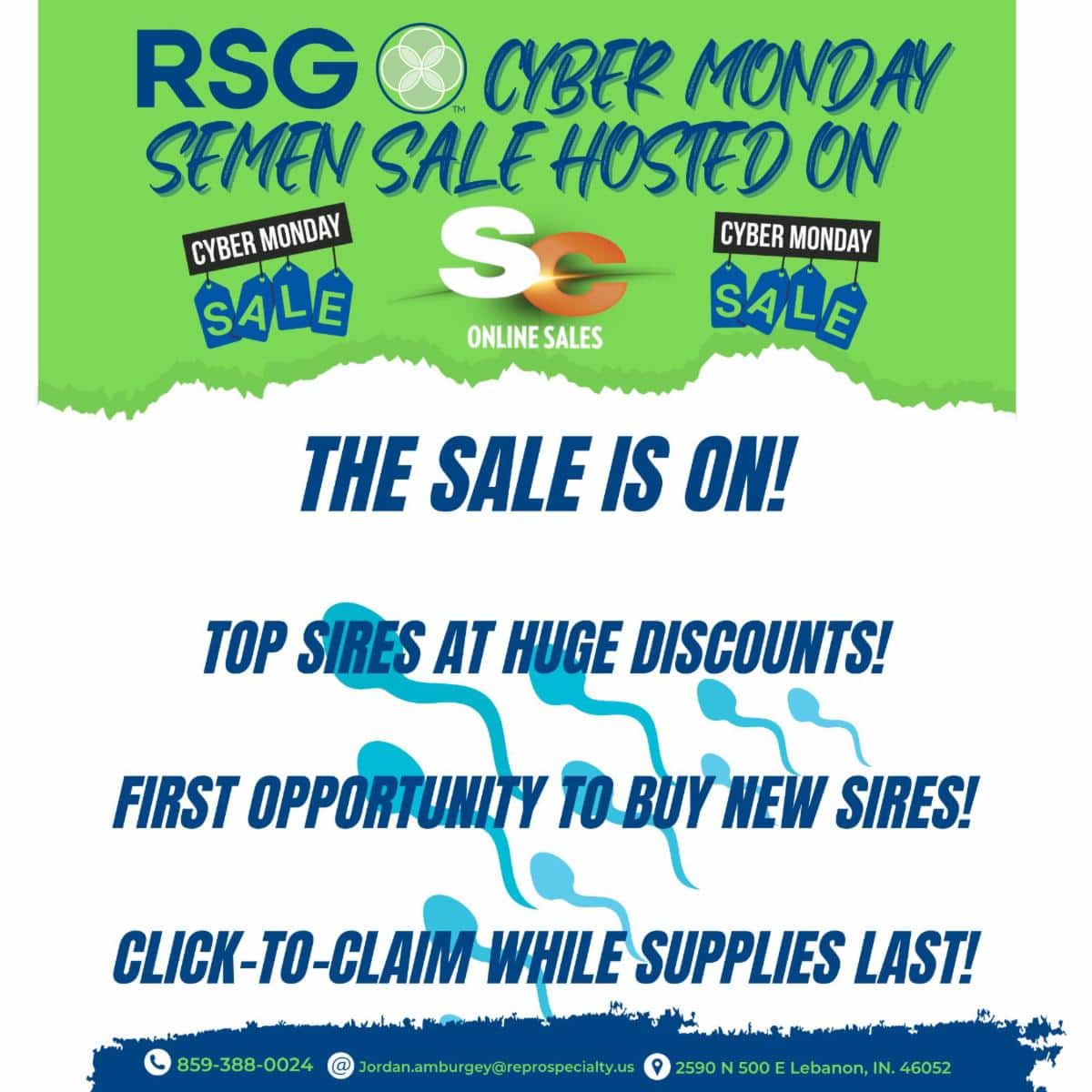 •   RSG Cyber Monday Semen Sale is LIVE TODAY ONLY! Take advantage of BIG savings on many sheep and goat sires at SC Online Sales. Non Registered Sheep Sires: https://sconlinesales.com/Bids/AuctionsListing/35431 Registered Sheep Sires: https://sconlinesales.com/Bids/AuctionsListing/34968 Goat Sires: https://sconlinesales.com/Bids/AuctionsListing/35432 SC Online Sales RSG Sires Frozen Embryo and Pregnant Recip Sale Join us December 5th for our first