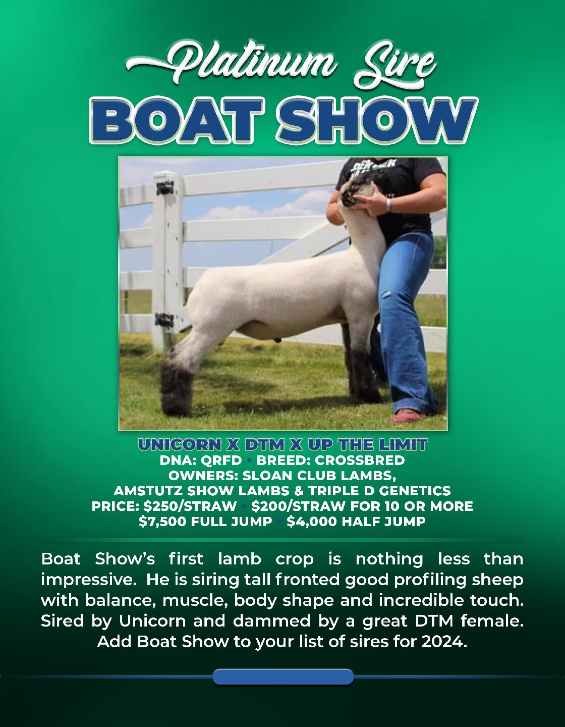 Boat Shows first lamb crop is nothing less than impressive. He is siring tall fronted good profiling sheep with balance, muscle, body shape and incredible touch. Sired by Unicorn and damned by a great DTM female. Add Boat Show to your list of sires for 2024.