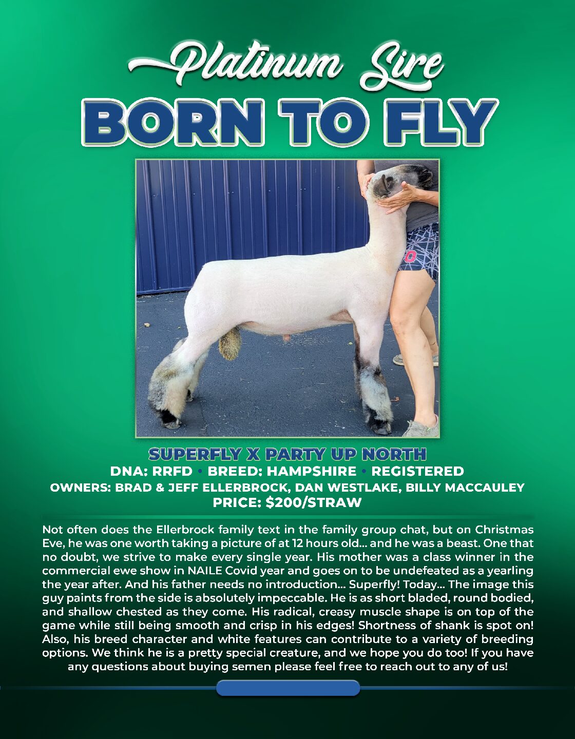 Description: Born to Fly continues to be a contributor to all aspects of the sheep business. He was special when he hit the ground at Ellerbrocks, was the SUPREME CHAMPION WETHER SIRE at the 2022 MWSRS and should make everyone’s short list as a confident sire choice. His mother was a commercial ewe class winner at NAILE and his sire “Super Fly” continues to crush it all over the country. His picture absolutely confirms his integrity of impeccable build, round body, shallow chest, and athletic muscle shape all while being smooth and crisp in his edges. His added features in bone, shag, and Hampshire feature have been seen in his many winners at the MWSRS, Ohio State Fair, NAILE and kids have been lining up at the backdrop with their Born To Fly partners. If you are looking for one that has a track record in the barn and on the road and is the real deal, Born to Fly is an easy choice offered up by a partnership that has more years in the business than most will endure. We think he is a special creature and we hope you do too. If you have any questions about Born To Fly and semen decisions, please reach out to any of us and we would be more than happy to assist.
