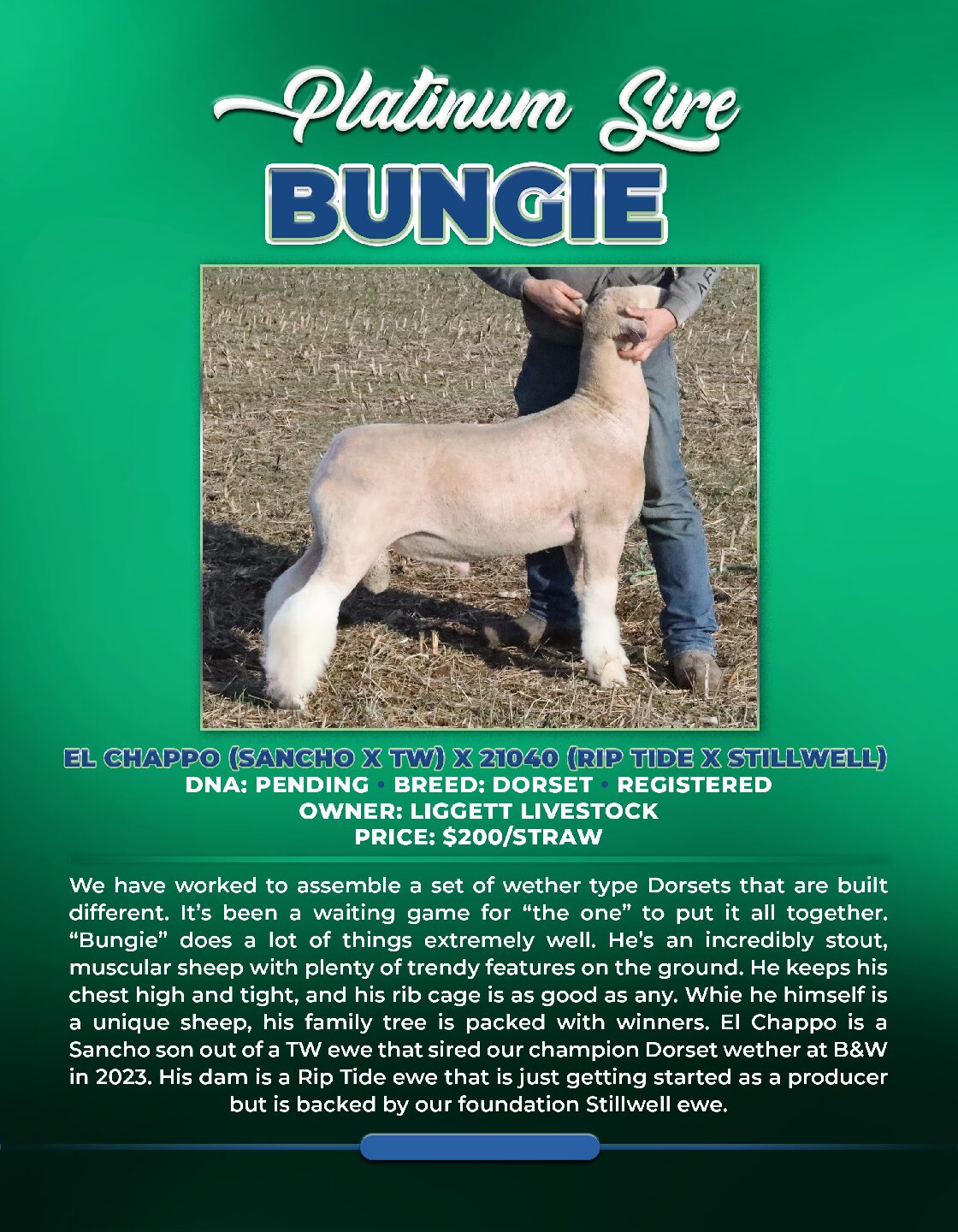 We have worked to assemble a set of wether type Dorset’s that are built different. It’s been a waiting game for “the one” to put it all together. “Bungie” does a lot of things extremely well. He’s an incredibly stout, muscular sheep with plenty of trendy features on the ground. He keeps his chest high and tight, and his rib cage is as good as any. Whie he himself is a unique sheep, his family tree is packed with winners. El Chappo is a Sancho son out of a TW ewe that sired our champion Dorset wether at B&W in 2023. His damn is a Rip Tide ewe has is just getting started as a producer but is backed by our foundation Stillwell ewe.
