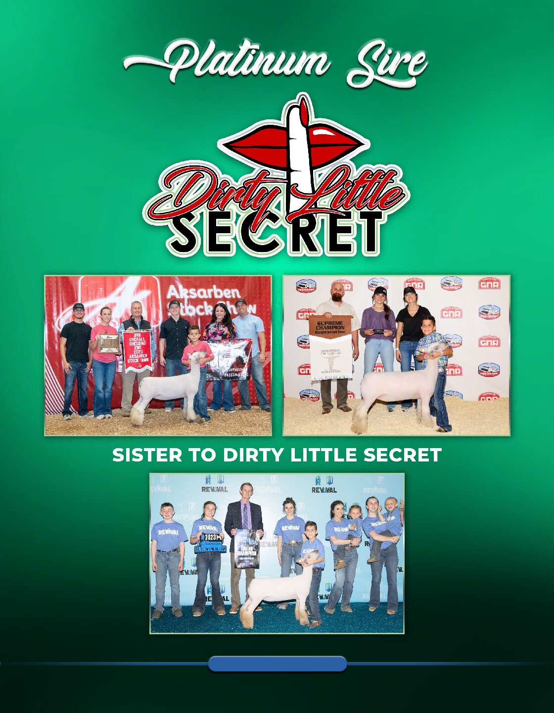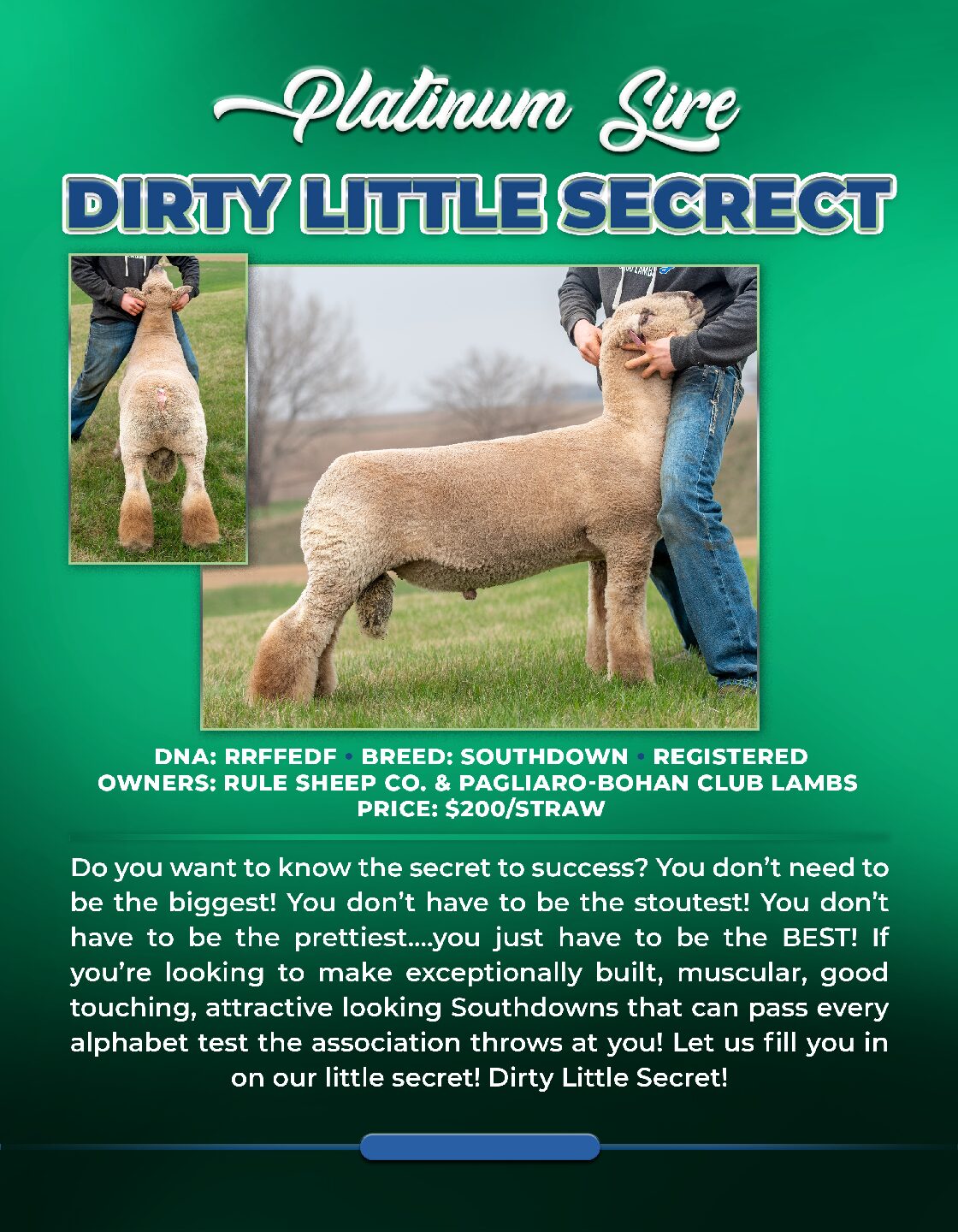 Do you want to know the secret to success? You don’t need to be the biggest! You don’t have to be the stoutest! You don’t have to be the prettiest… You just have to be the best! If you’re looking to make exceptionally built, muscular, good touching, attractive looking Southdowns that can pass every alphabet test the association throws at you! Let us fill you in on our little secret! Dirty Little Secret!