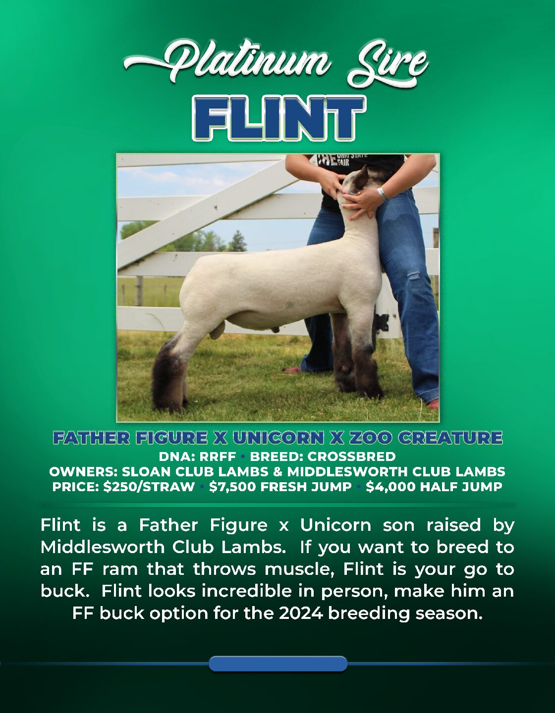 Flint is a Father Figure x Unicorn son raised by Middlesworth Club Lambs. If you want to breed to an FF ram that throws muscle Flint, is your go to buck. Flint looks incredible in person, make him an FF buck option for the 2024 breeding season.