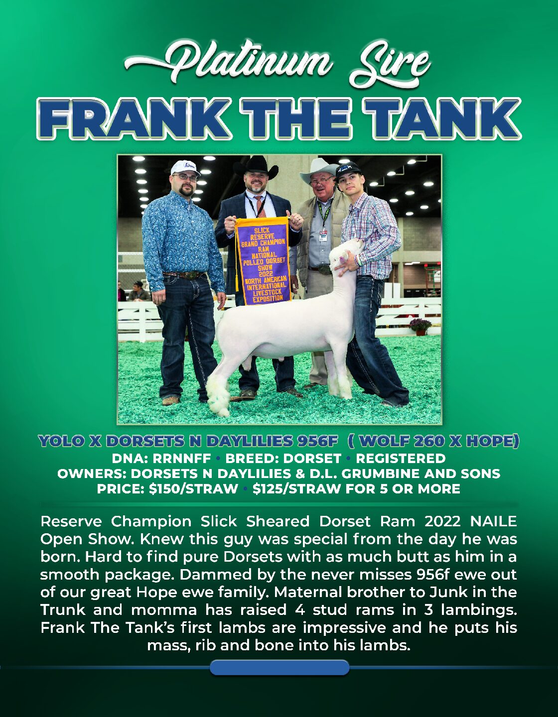 Reserve Champion Slick Sheared Dorset Ram 2022 NAILE Open Show. Knew this guy was special from the day he was born. Hard to find pure Dorsets with as much butt as him in a smooth package. Dammed by the never misses 956f ewe out of our great Hope ewe family. Maternal brother to Junk in the Trunk and momma has raised 4 stud rams in 3 lambing’s. Frank The Tanks first lambs are impressive and he puts his mass, rib and bone into his lambs.