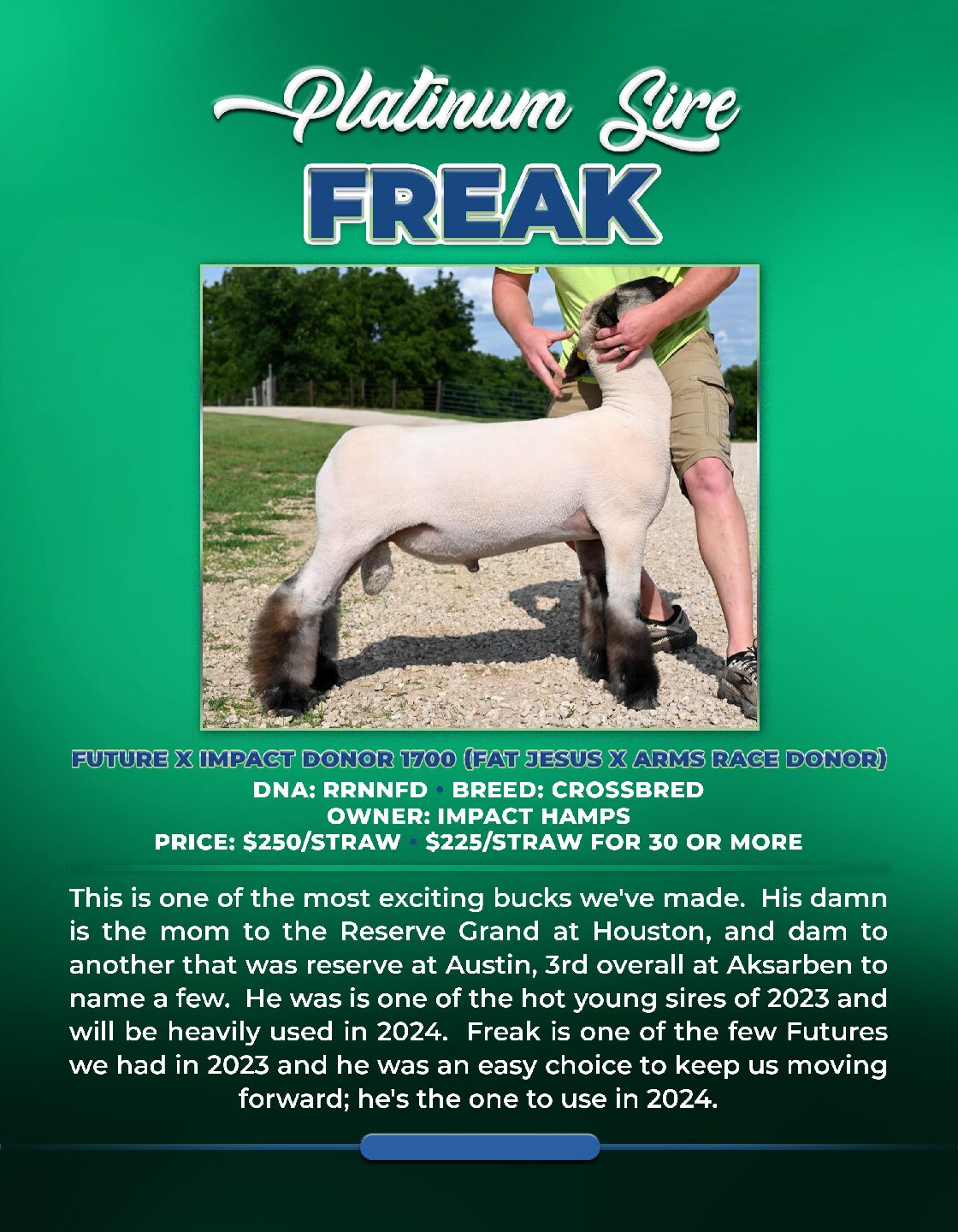 This is one of the most exciting bucks we’ve made. His damn is the mom to the Reserve Grand at Houston, and damn to another that was reserve at Austin, 3rd overall at Aksarben to name a few. He was is one of the hot young sires of 2023 and will be heavily used in 2024. Freak is one of the few Futures we had in 2023 and he was an easy choice to keep us moving forward; he’s the one to use in 2024