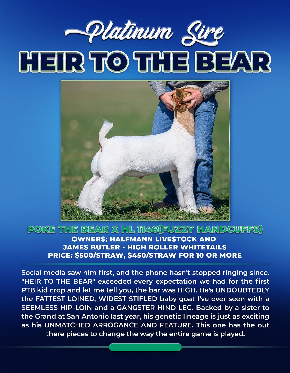Social media saw him first, and the phone hasn’t stopped ringing since. “HEIR TO THE BEAR” exceeded every expectation we had for the first PTB kid crop and let me tell you, the bar was HIGH. He’s UNDOUBTEDLY the FATTEST LOINED, WIDEST STIFLED baby goat I’ve ever seen with a SEEMLESS HIP-LOIN and a GANGSTER HIND LEG. Backed by a sister to the Grand at San Antonio last year, his genetic lineage is just as exciting as his UNMATCHED ARROGANCE AND FEATURE. This one has the out there pieces to change the way the entire game is played.