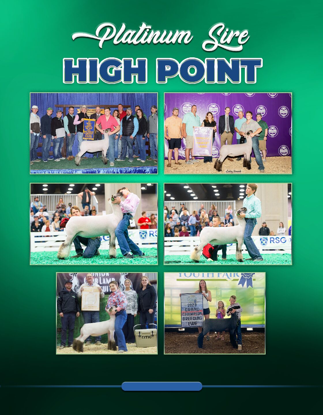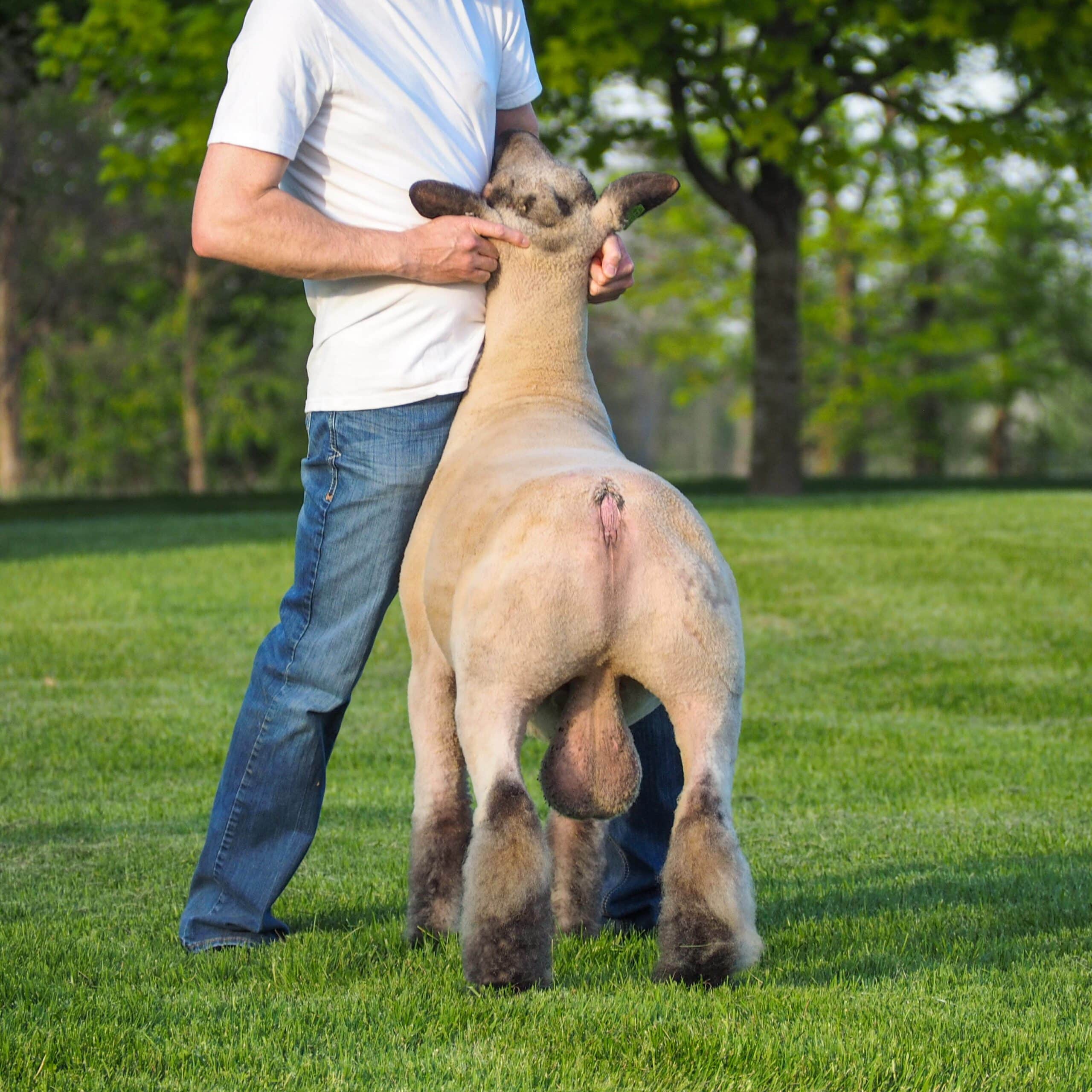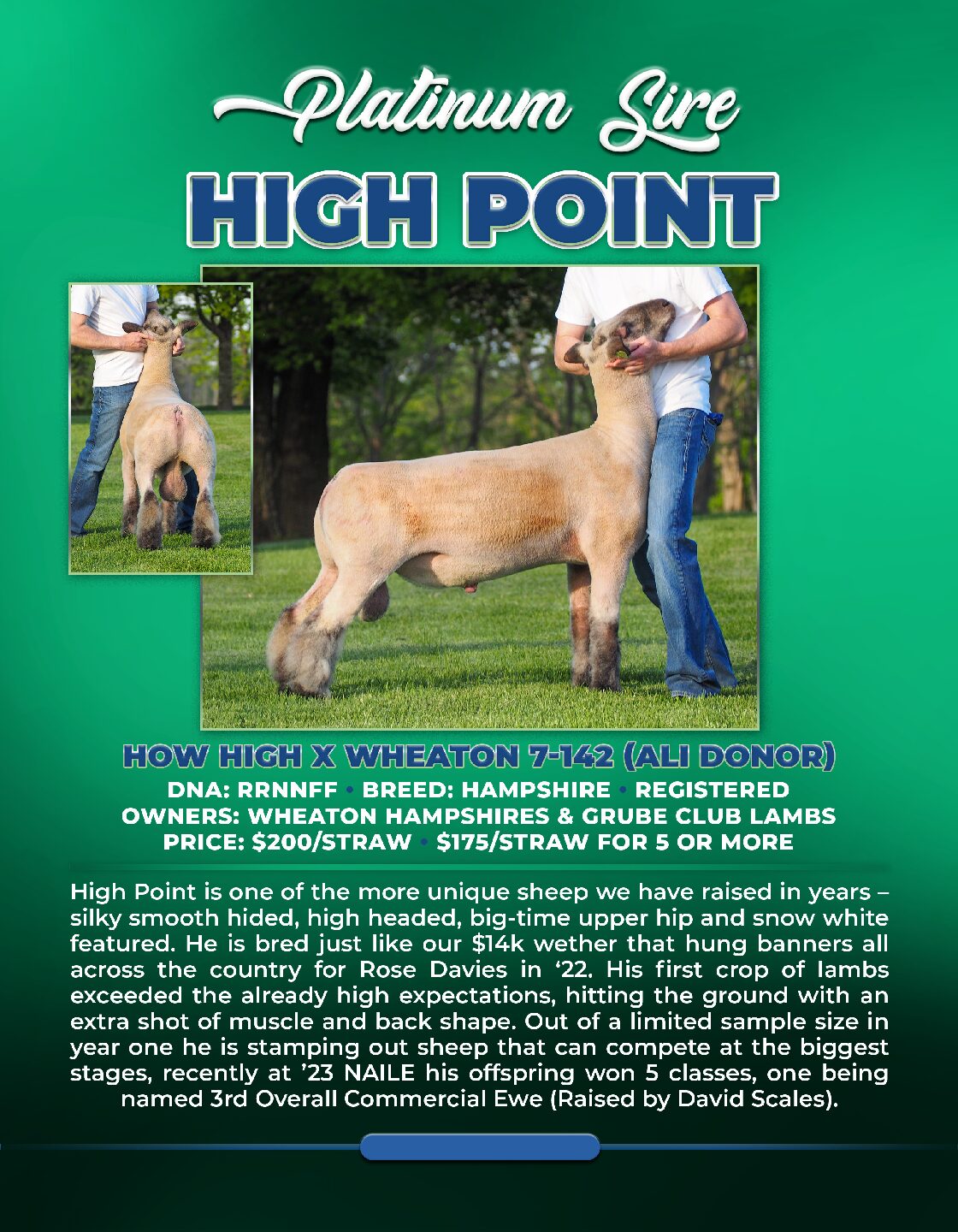 High Point is one of the more unique sheep we have raised in years – silky smooth hided, high headed, big-time upper hip and snow white featured. He is bred just like our $14k wether that hung banners all across the country for Rose Davies in ’22. His first crop of lambs exceeded the already high expectations, hitting the ground with an extra shot of muscle and back shape. He is stamping out sheep that can compete at the biggest stages – they have the ‘freak pieces’ that can put you over the top.