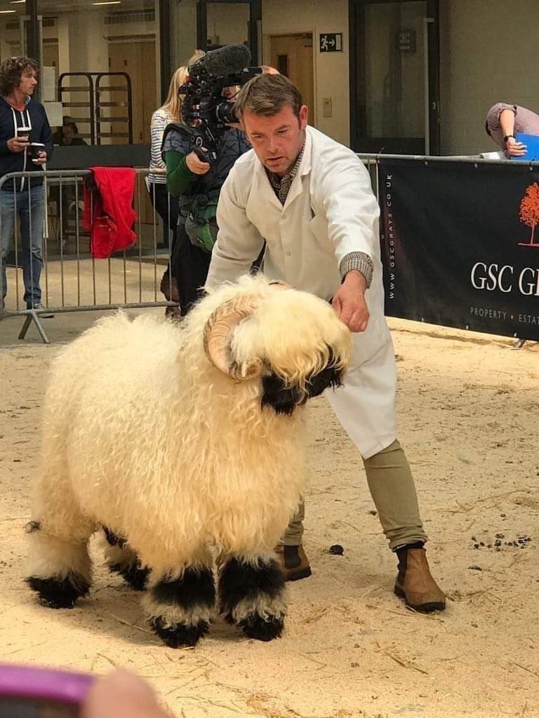 Description: “Picture is of Highland Eric the sire of Highland Hamish. Hamish is developing a name for himself in the USA. He has sired several class winners and the 2024 Champion whether at the USA National Valais Blacknose Sheep Show.