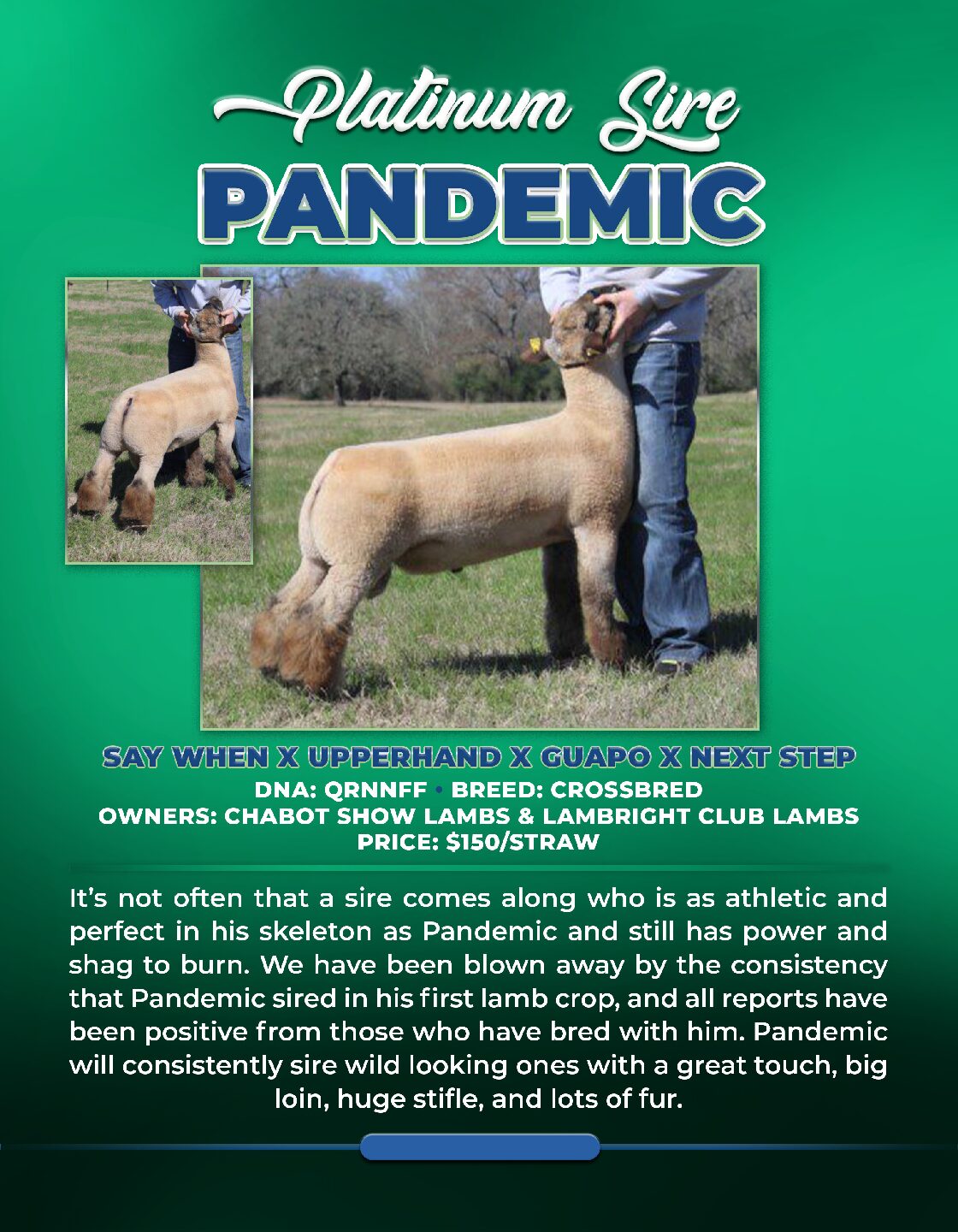 It’s not often that a sire comes along who is as athletic and perfect in his skeleton as Pandemic, and still has power and shag to burn. We have been blown away by the consistency that Pandemic sired in his first lamb crop, and all reports have been positive from those who have bred him. Pandemic will consistently sire wild looking ones with a great touch, big loin, huge stifle, and lots of fur.