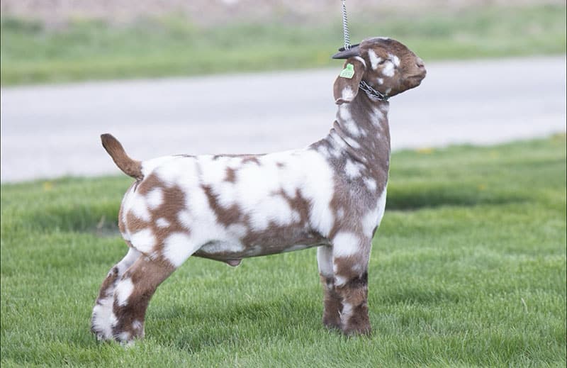 Description: 2024 ABGA National 3-6 Class Winner – Roughly two years ago Hanna Peterson acquired the entire colored goat program from Mark Fraser and myself. When Hanna sent a quick roughed out video of DELIVERANCE this summer, we were excited that they were working out for her. When she told us his pedigree, we knew we had to get him in the stud. His mom, Redemption, was the Grand Champion Junior Fullblood Doe at NAILE for Nash Hensley. She is one of the absolute most impressive dappled does we have ever witnessed. Deliverance looks as close to Outcast as I can remember. A special kind of spotted sire that needs used heavily!