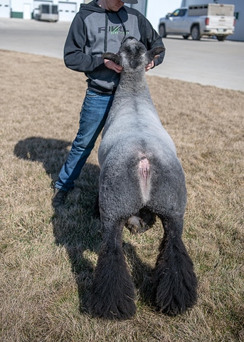 Description: Potentially Dangerous is sired by Ride Time and dammed by Hild Brothers “Jara” Donor (Drop The Mic). Rule Sheep Co invested big money on this guys mom at Hild Brother’s Breds, Brats & Brews sale in the fall of 2022. He is great touching, elegant patterned and has feet and fuzz bigger than a 5 gallon bucket. You can expect him to produce sheep that are tricked out with all the bells and whistles on top of adding extra extension, elevation and structural integrity.
