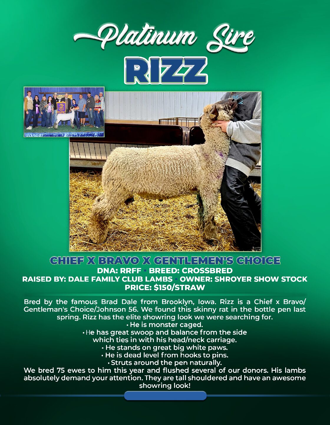 We bred 75 ewes to him this year and flushed several of our donors. His lambs absolutely demand your attention. They are tall shouldered and have an awesome showring look!
