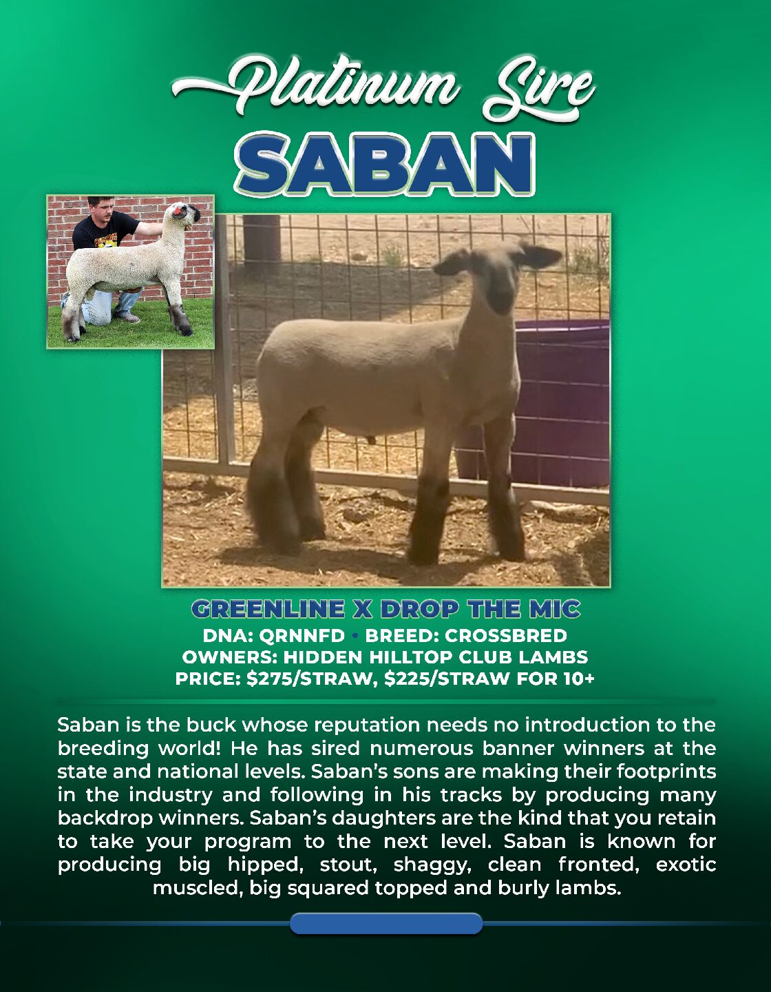 Saban is the buck whose reputation needs no introduction to the breeding world! He has sired numerous banner winners at the state and national levels. Saban’s sons are making their footprints in the industry and following in his tracks producing many backdrop winners. Saban’s daughters are the kind that you retain to take your program to the next level. Saban is known for producing big hipped, stout, shaggy, clean fronted, exotic muscled, big squared topped and burley lambs.