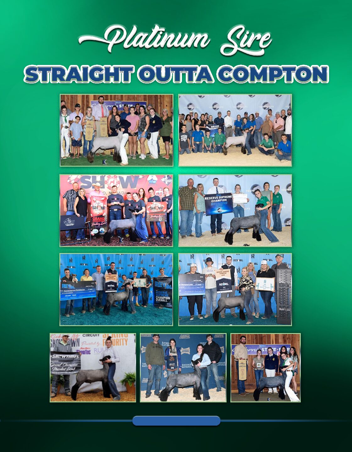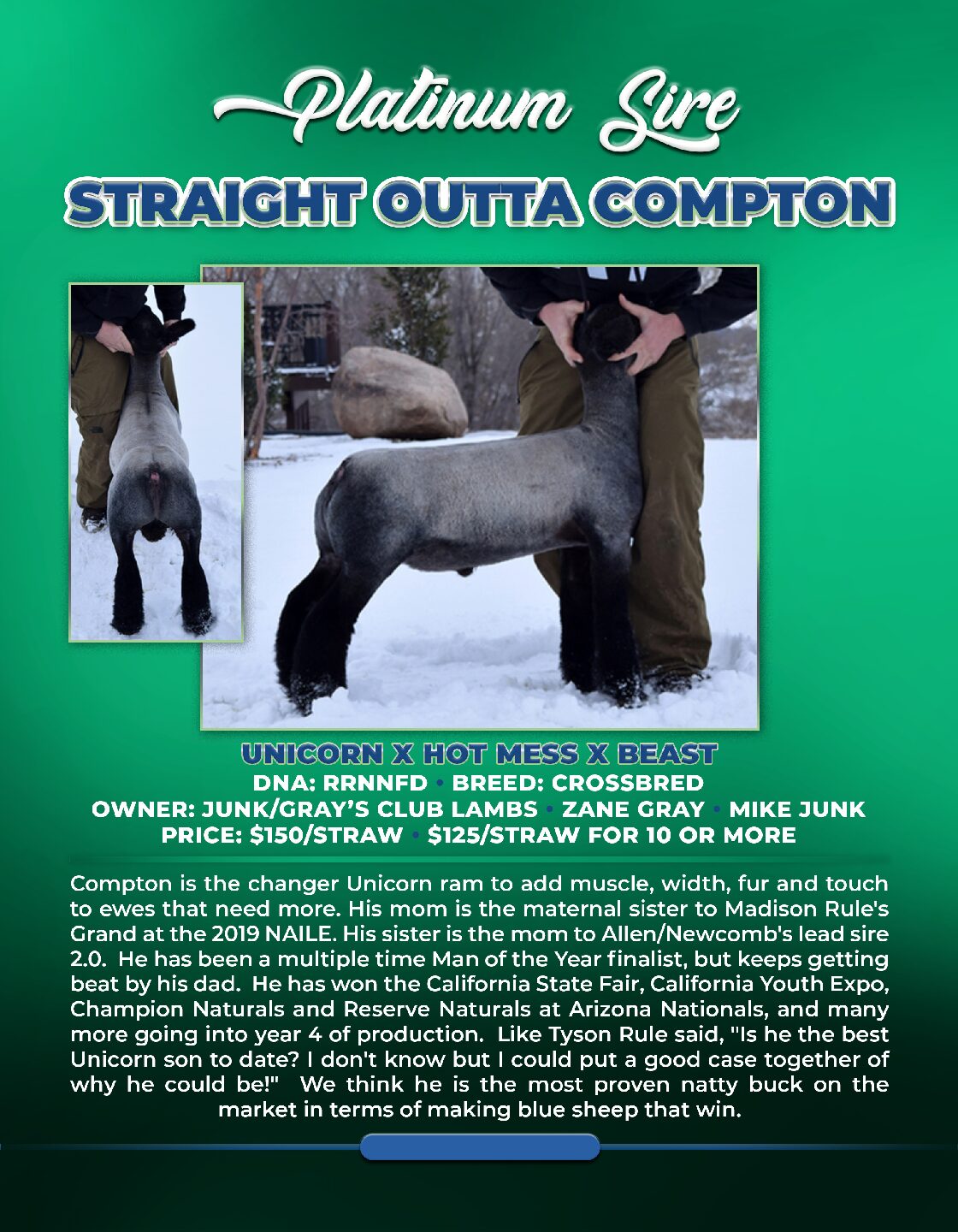 Compton is the changer Unicorn ram to add muscle, width, fur and touch to ewes that need more. His mom is the maternal sister to Madison Rule’s Grand at the 2019 NAILE. His sister is the mom to Allen/Newcomb’s lead sire 2.0. He has been a multiple time Man of the Year finalist, but keeps getting beat by his dad. He has won the California State Fair, California Youth Expo, Champion Naturals and Reserve Naturals at Arizona Nationals, and many more going into year 4 of production. Like Tyson Rule said, “Is he the best Unicorn son to date? I don’t know but I could put a good case together of why he could be!” We think he is the most proven natty buck on the market in terms of making blue sheep that win.