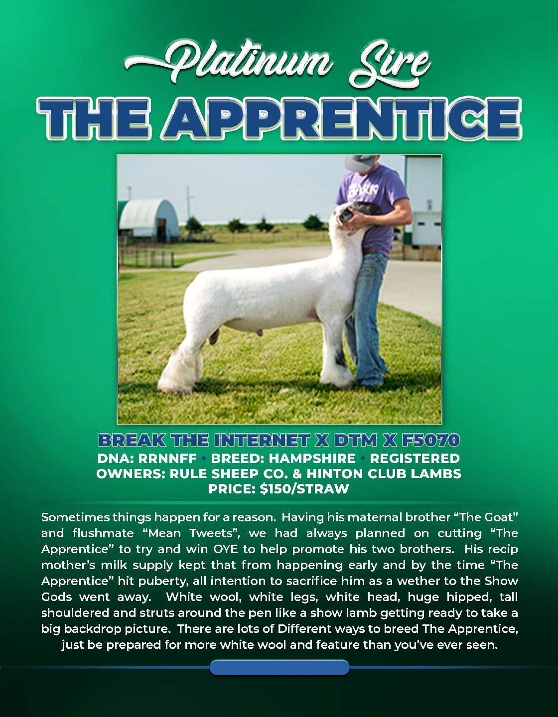 The Break the internet outlier shape, nide, and expression coming from toat’s mom on the maternal side with the power, fuzz, and stoutness hitting from his daddy. If your wanting to make sheep taller fronted, whiter wooled, with muscle and style to Burn, you need to breed ewes to the Apprentice.