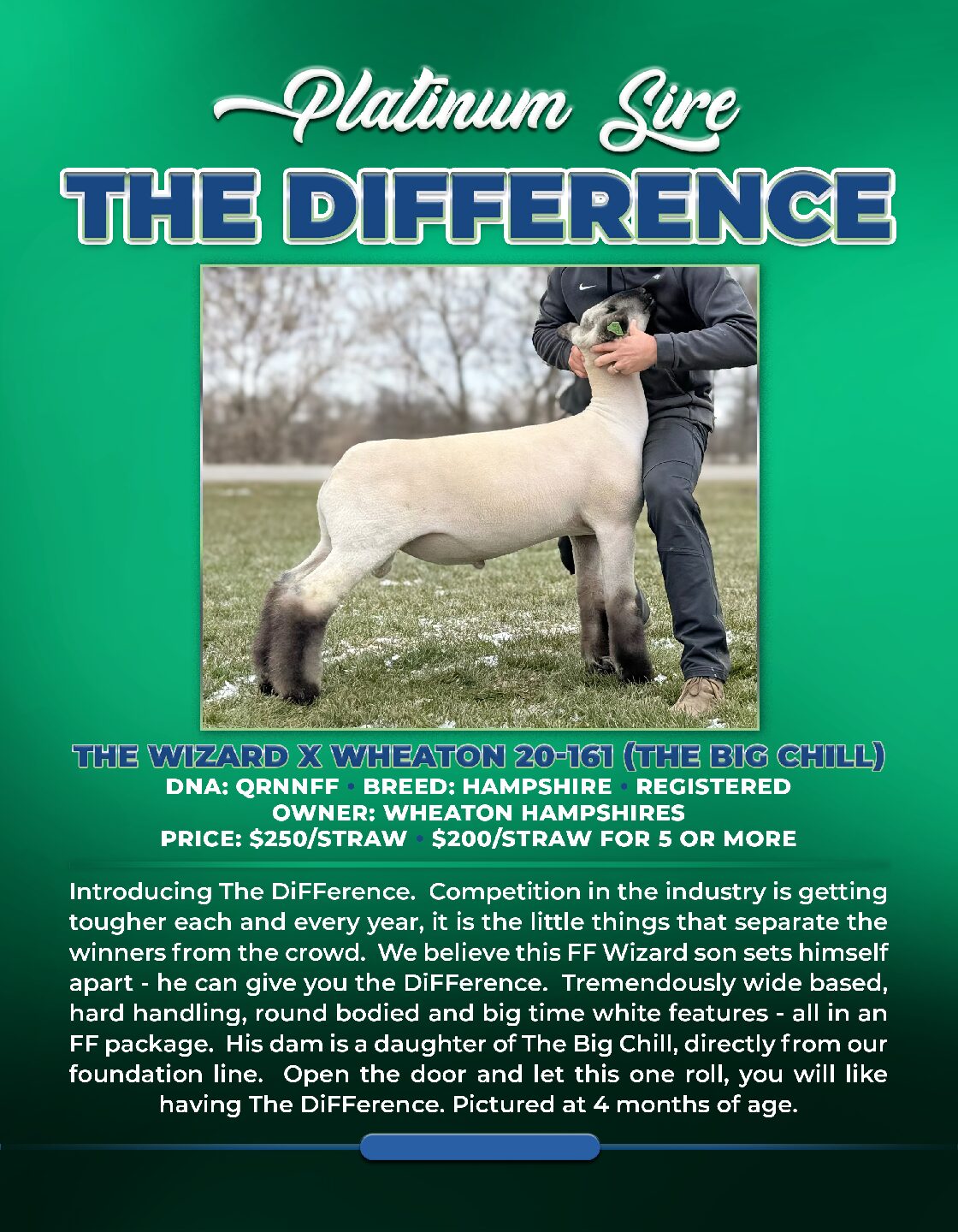 Introducing The DiFFerence, our ’24 keeper out of The Wizard. Competition in the industry is getting tougher each and every year, it is the little things that separate the winners from the crowd. We believe this FF Wizard son sets himself apart – he can give you the DiFFerence. Tremendously wide based, hard handling, round bodied and big time white features – all in an FF package. His dam is a daughter of The Big Chill, directly from our foundation line. Open the door and let this one roll, you will like having The DiFFerence.