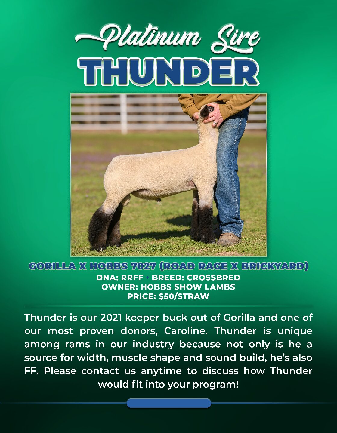 Thunder is now VERY well proven! He was our 2021 keeper buck out of Gorilla and one of our most notable donors, Caroline. Thunder is unique among rams in our industry because not only is he a source for width, muscle shape and sound build, he’s also FF! Please contact us anytime to discuss how Thunder would fit into your program!