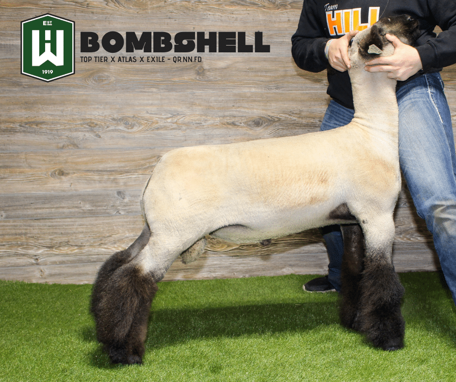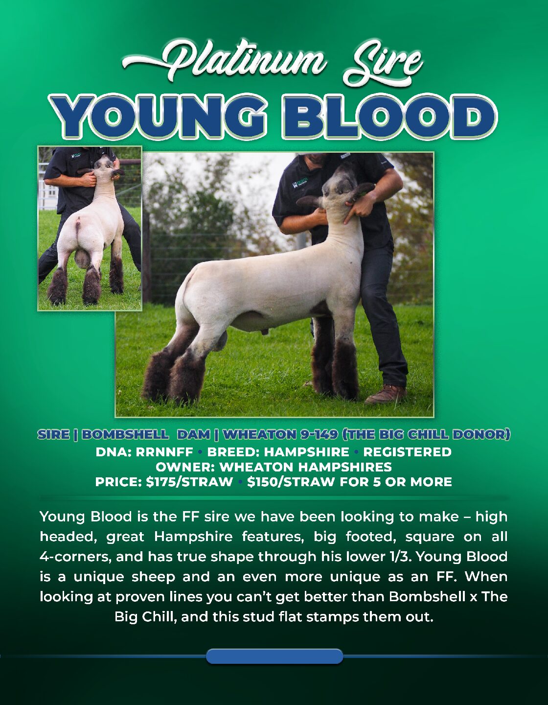 Young Blood is the FF sire we have been looking to make – high headed, great Hampshire features, big footed, square on all 4-corners, and has true shape through his lower 1/3. Young Blood is a unique sheep and an even more unique as an FF. When looking at proven lines you can’t get better than Bombshell x The Big Chill, and this stud flat stamps them out.